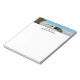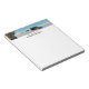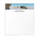A notepad with a scenic nature photograph. Beautiful turquoise blue sea with a sandy beach. A big brown rock provides some shade from the bright blue sky.