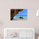 Poster with a scenic nature photograph. Beautiful turquoise blue sea with a sandy beach. A big brown rock provides some shade from the bright blue sky.