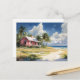 Charming oceanfront cottage surrounded by lush greenery, palm trees, and a serene beach. Under a blue sky with clouds, the tranquil scenery captures tropical paradise vibes and invites relaxation.