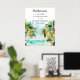 Ce panneau d'accueil mariage d'aquarelle élégant et magnifique dispose d'une plage, d'un ciel bleu et de palmiers. Le texte combine écriture manuscrite et polices sans serif pour un look élégant et moderne. Il est parfait pour une plage d'été ou un mariage de destination tropicale.