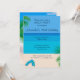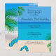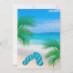 The back of this beautiful birthday party invitation features a relaxing scene with a beautiful tropical beach, palm trees and a pair of flip flops on the sand. The front includes deep blue text with all the details on a plain background of sand, ocean, and sky colours matching the beach scene on the back, framed in a hint of palm leaves. A pair of flip flops sits in the lower left corner on the front of the invitation. You can edit all of the text to personalize this invitation for your own birthday party.