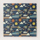 Vibrant tropical pattern with suns, waves, palm trees, mountains, and sailboats on a dark background. Perfect for summer designs.
