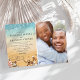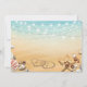 Tropical beach destination wedding invitations featuring a rustic ombre yellow to watercolor blue background, starfish, seashells, string lights, two hearts in the sand with your initials, a photo of the couple, and an elegant wedding template that is easy to personalize.