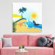 Tropical beach, ocean with surfer wrapped canvas print, featuring a tropical landscape. There are palm trees and a starfish on the sand beach, a surfer on the waves and a whimsical sun made of circles.