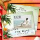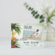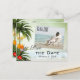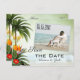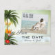 Save the Date postcard featuring your own favourite photo framed by a tropical green turquoise beach scene with palm trees, festive lanterns and colourful exotic flowers. Perfect for a planned beach or destination wedding. (Your photo should automatically rotate to fit the frame).