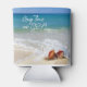 Escape to the beach in your mind's eye when using this coozie to keep your beverage cold. Tropical beach scene photograph of crashing waves over two seashells and the say LONG TIME NO SEA.