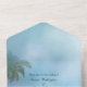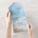 Tropical feel wedding tri-fold invitation done in graphics of a sandy beach with palm trees and blue water. Personalize the text to suit your wedding needs. Matching products are available.