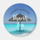 A wedding thank you magnet with a photograph of a scenic tropical beach in The Maldives. A white sandy beach and crystal blue waters with a solo thatched umbrella. Secluded and serene.