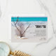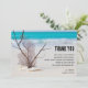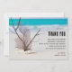Thank you card with a gorgeous photograph. Tropical blue water and foamy surf in the background. A collection of seashells and stems set on a white sandy beach.
