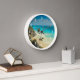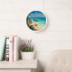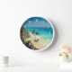 A clock with a beautiful photo featuring Tulum, Mexico. Turquoise waters on a sandy shore. Wind swept palm trees blowing in the breeze near a craggy cliff side. Soothing and relaxing.