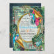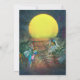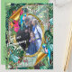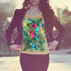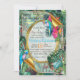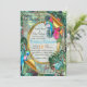 Tropical birds among green plant leaves and interwoven foliage and flowers with a sunset background to personalise announcement card