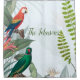 Tropical birds (parrots) surrounded by foliage and flowers including large-leaf calathea and bird-of-paradise. Great design for nature lovers, Caribbean / tropics lovers, coastal details, island themed details, and animal lovers.