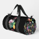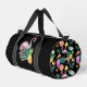 A toucan bird, a pink flamingo, and a bright pineapple combine with an ice cream cone, ice cream bars, a bright grapefruit slice, and a lemon, along with gold stars and green palm leaves to form a fun tropical pattern on this bag. The multi coloured, bright images are placed on a dramatic black background on each end. The front and back have images of the flamingo, a palm leaf, and pineapple. Your two letter monogram is in pink on the front. Bright, colourful and fun!