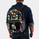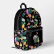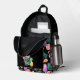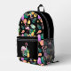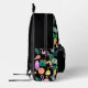 A toucan bird, a pink flamingo, and a bright pineapple combine with an ice cream cone, ice cream bars, a bright grapefruit slice, and a lemon, along with gold stars and green palm leaves to form a fun tropical pattern on this backpack. The multi coloured, bright images are placed on a dramatic black background. Bright, colourful and fun, no matter where you spend the summer!