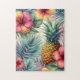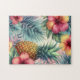 A lively and colorful tropical pattern featuring ripe pineapples nestled among lush teal palm leaves and vibrant hibiscus flowers in shades of red, pink, and orange. This design captures the essence of a tropical paradise, blending exotic flora with a fresh, summery vibe.