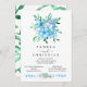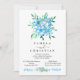 Blue hibiscus flowers, white plumeria flowers, and eucalyptus leaves bouquet is beautiful with turtle and blue orchids border. Tropical blue and leafy green wedding invitations are easy to personalize. Watercolor floral artwork is versatile for royal blue, bahama blue, sky blue colour templates. Perfect for Hawaii destination wedding or any other tropical beach weddings.