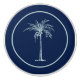 Add your own special touch to this simply elegant design featuring a tropical palm tree and circular border in light pale teal over a navy blue background.