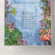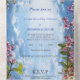 Blue marble pillars, archways leading to an outdoor light blue sky with fluffy clouds, or to an indoor fantasy palace, with steps leading into a water pond, greenery ,plants, pink flowers, flamingos and an old fashioned cane reading chair. This design is printed on decor,clothes and personalized invitation cards for weddings and other events.