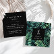 Elegant hairstylist or salon business cards with a chic tropical island vibe feature a background of vibrant green jungle botanical leaves. Personalize the front with your name or business name beneath a pair of stylist's scissors, and add your full contact information to the back in modern white lettering on a crisp black background.