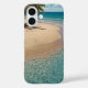 A calming tropical beach with turquoise waves, golden sand, and swaying palm trees under a bright blue sky. Perfect for a refreshing summer-inspired phone case design.