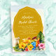 Tropical bridal shower, or bachelorette party, invitations. Specialty drinks and hibiscus flowers decorate the bottom of this custom invitation. A gold panel holds the wording with her name and party title in script. Use for any tropical / luau themed pre-wedding event.