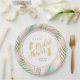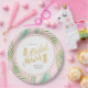 Elegant and chic tropical bridal shower paper plates. Celebrate your bridal shower in style with these custom plates with faux gold foil "Bridal Shower" text and gold pineapples and the shower date and honoree's name - personalize for your shower! Featuring green palm fronds and pink accents around the edge. Please note: metallic elements will print to look like gold foil, but the invitations will contain no actual gold foil, glitter, or metallic ink.
