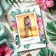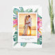 These folded tropical wedding thank you cards feature a photo of the bride and groom framed by pink hibiscus flowers with monstera palm leaves. Use the template fields to add the bride and groom names and custom text. A tropical choice for bridal shower and weddings. To see more destination wedding supplies like this visit www.zazzle.com/dotellabelle