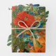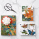 Three sheets of unique gift wrap in three designs with tropical leaves and flowers and a mash up of 3 animals with butterflies.