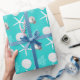 Pretty aqua blue, tropical themed gift wrap on a roll. With a pattern of sea stars (starfish), sand dollars, ball ornaments and a swirly Christmas tree, this paper will fit perfectly in a warm climate, or coastal home.