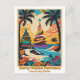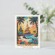 A gorgeous tropical Christmas postcard with a vibrant, colourful image of palm trees, a beach, flowers and two Christmas trees!