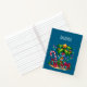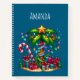 Spiral notebook with a seasonal holiday image. A tropical palm tree decorated in festive lights with a star on top. A giant red and white candy cane sticking out of the sand. Christmas presents under the tree. Whimsical and fun.