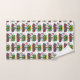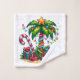 Towel set with a seasonal holiday image. A tropical palm tree decorated in festive lights with a star on top. A giant red and white candy cane sticking out of the sand. Christmas presents under the tree. Whimsical and fun.