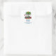 Business stickers with a seasonal holiday image. A tropical palm tree decorated in festive lights with a star on top. A giant red and white candy cane sticking out of the sand. Christmas presents under the tree. Whimsical and fun.
