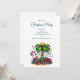 A Christmas invitation with a seasonal holiday image. A tropical palm tree decorated in festive lights with a star on top. A giant red and white candy cane sticking out of the sand. Christmas presents under the tree. Whimsical and fun.