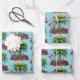 Wrapping paper sheets with a seasonal holiday image. A tropical palm tree decorated in festive lights with a star on top. A giant red and white candy cane sticking out of the sand. Christmas presents under the tree. Whimsical and fun.