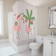 This Christmas holiday shower curtain features a cute cartoon illustration over a soft pink background. Two pink flamingos are having a party with gifts and Christmas lights. A cute little snowman is standing in front of a tropical palm tree.