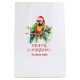 This festive tropical Christmas-themed design features- Merry Christmas -beautiful red retro typography with a tropical Christmas bird in a Santa hat.
