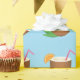 Cute cartoon illustration of a tropical coconut drink. The drink consist of a delicious brown coconut, a pink straw and a slice of an orange. There are two green leaves under the coconut as well. The background colour is blue.