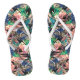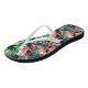 Des tongs noirs avec un motif de plantes tropicaux verts, pêche, crème et bleus, parfaits pour habiller votre tenue pour toutes les occasions.