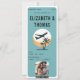A trendy design of an airplane ticket wedding invitation with a tropical destination theme (Hawaii etc.) featuring a modern illustration of an airplane taking off over waves and palm trees, with the glowing sun in the background,, will delight couple and guests, looking forward to the big day. Template for a picture of the happy couple. An all in one modern wedding invitation that includes the details on the back and the RSVP card with a QR code.