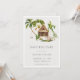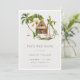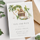 This wedding save the date invitation is a tropical jungle design with the colours of nature. It features palm trees, luscious rainforests, and bungalows nestled within a beautiful tropical paradise setting.