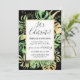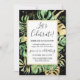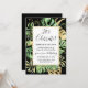 This elegant tropical elopement wedding celebration invitation features green and gold palm, philodendron, and fern leaves on a black background. An elegant gold frame highlights the black text. Gold splatters accentuate this exotic botanical design and brings a bit of modern whimsy to the invitation. "Let's Celebrate!" along with the newlyweds' names are featured at the top. The wedding vow details and reception details are underneath. RSVP information is on the back of the invitation.