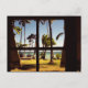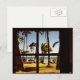 Tropical Fiji Beach Scene - Photograph of a beach in the Fiji Islands with palm trees, hammocks and a picnic bench seen through the open shutters of a beach hut.