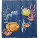 This shower curtain features an artistic fish aquarium theme. Four colourful tropical fish, coral and sea plants are placed over a dark navy blue background.