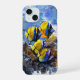 Tropical fish glide alone reef in clear blue water in a grunge style painting.