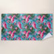 This beach towel is shown in a lovely tropical flower flamingo print.