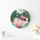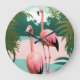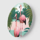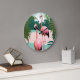 A serene scene of two pink flamingos standing by a lush tropical shoreline, surrounded by vibrant green foliage and soft pastel tones. Perfect for adding a touch of exotic beauty to any space.