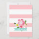A fun and festive bridal shower invitation featuring a pink flamingo surrounded by tropical hibiscus flowers, plumeria blooms, and lush palm fronds on a bright aqua background. The playful island-inspired design is perfect for a summer or destination celebration. The reverse features a pink and white stripe backing with tropical floral accent. All text is fully editable for your event.