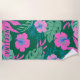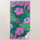 Modern, trendy floral beach towel with a pink flowers and green tropical leaves with a purple backgroud.Personalized it with your name.