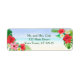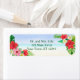 These tropical return address labels match the tropical floral wedding invitations. Bouquets of red and pink hibiscus, white plumeria, and green watercolor leaves frame the address, which can be easily personalized. A watercolor tropical beach scene is in the background.